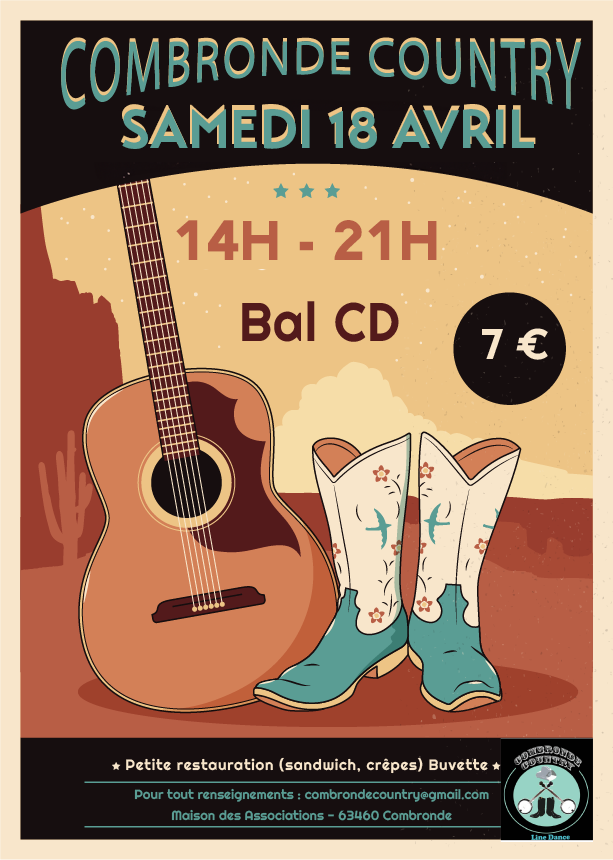 COMBRONDE (63) – Bal CD Détails de l'événement Date: 18/04/2026 14:00 – 21:00 Lieu: Maison des Associations Catégories: Agenda Organisation : COMBRONDE COUNTRY Laisser un commentaire Annuler la réponseVous devez être connecté pour publier un commentaire.