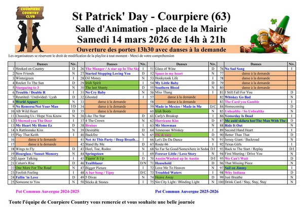 COURPIERE (63) – Bal CD « Saint-Patrick’s Day » Détails de l'événement Date: 14/03/2026 14:00 – 21:00 Lieu: Salle d'Animation Catégories: Agenda Organisation : COURPIERE COUNTRY CLUB Laisser un commentaire Annuler la réponseVous devez être connecté pour publier un commentaire.