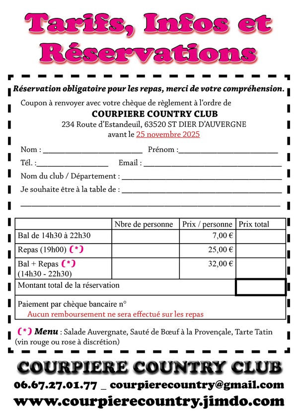 COURPIERE (63) – Bal CD Détails de l'événement Date: 29/11/2025 14:00 – 22:30 Lieu: Les Arcades de Barjavelle Catégories: Agenda Organisation : COURPIERE COUNTRY CLUB – Téléchargez ici la playlist : COURPIERE (63) – Samedi 29 novembre 2025 – Playlist Laisser un commentaire Annuler la réponseVous devez être connecté pour publier un commentaire.