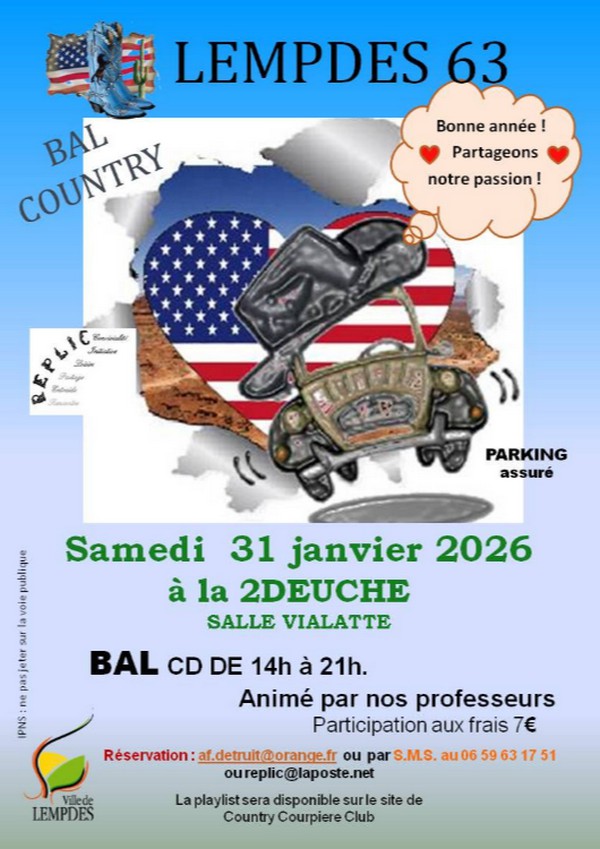 LEMPDES (63) – Bal CD Détails de l'événement Date: 31/01/2026 Catégories: Agenda Organisation : R.E.P.L.I.C. LEMPDES COUNTRY – LEMPDES (63) – Playlist – 31 janvier 2026 Laisser un commentaire Annuler la réponseVous devez être connecté pour publier un commentaire.