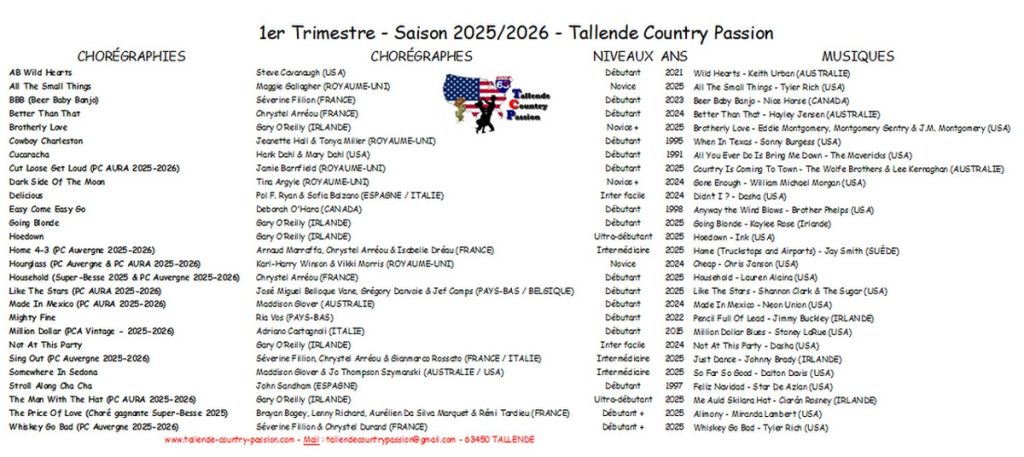 TCP 2025/2026 Auteur/autrice de la publication :Christine Chirain Publication publiée :19/10/2025 Post category:Blog Commentaires de la publication :0 commentaire SEPTEMBRE 2025 OCTOBRE 2025 NOVEMBRE 2025 DÉCEMBRE 2025 Récapitulatif des danses enseignées lors du 1er trimestre 2025/2026 Vous devriez également aimer LA FFDanse et la SACEM 16/11/2023 TCP 2023/2024 24/03/2024 Tallende Mag – Novembre 2020 10/12/2020 Laisser un commentaire Annuler la réponseVous devez être connecté pour publier un commentaire.